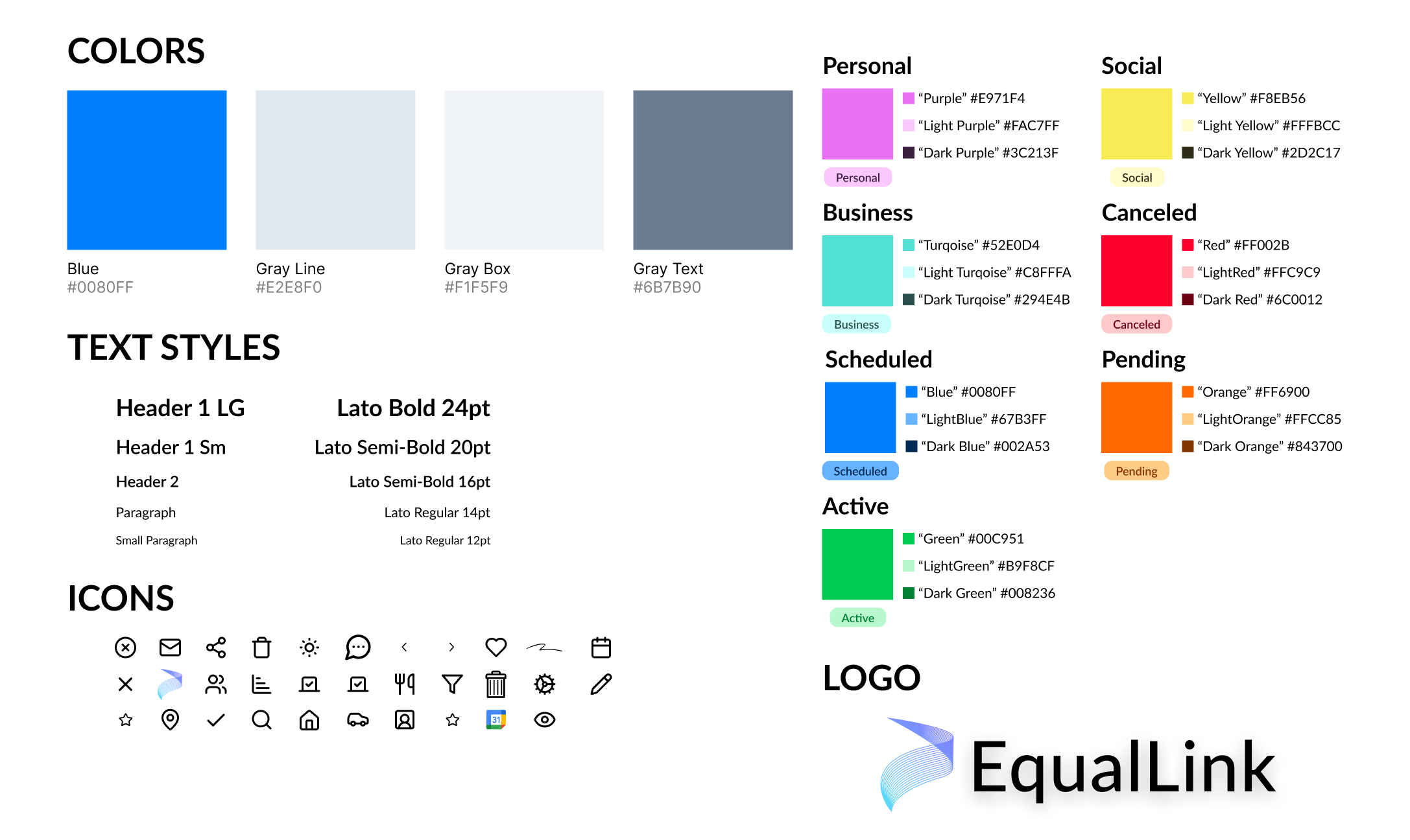 In creating our design system, I chose colors not only for the brand but also to fit each of the different meeting types and the different meetings statuses. I also chose Lato as the font, and created a library of icons we could use throughout the product.