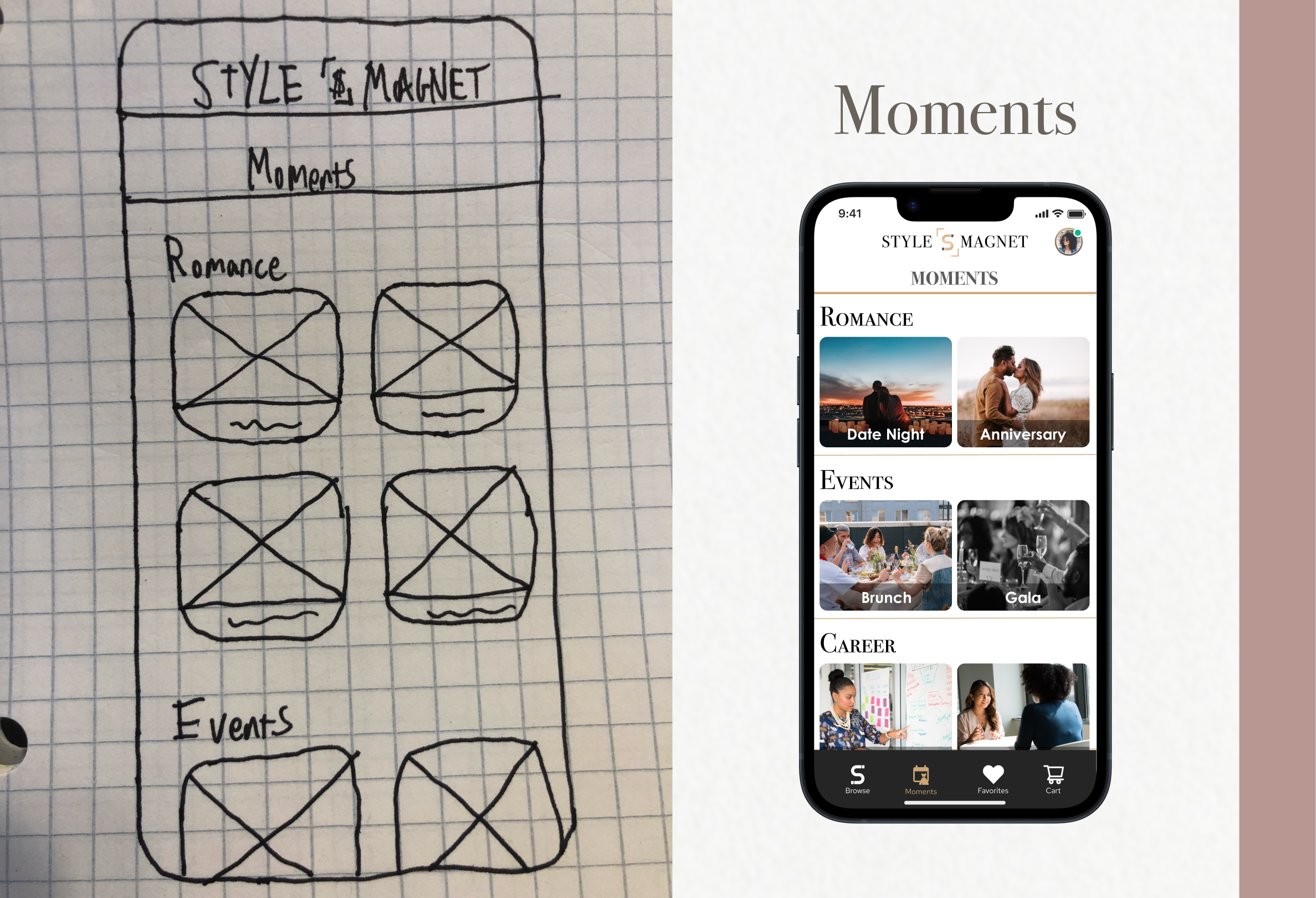 Our initial wireframes focused on providing a simpler user flow for shoppers looking to buy for specific occasions. The first mockups we designed featured the purchase flow, from outfits to items, and organizing outfits into common occasions or moments in life.